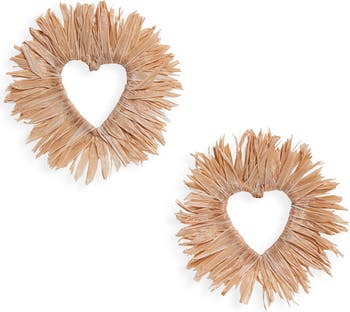 Handwoven raffia radiates from an open heart silhouette, creating a striking interplay of texture and light on these statement earrings.