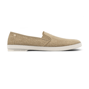 Rivieras Leisure Shoes presents the Raffia Slip-On Loafer, from our "NuDude" Collection. Crafted from natural raffia-effect textured fabric for a fresh, breezy look. Inside, soft ecru canvas lining and a removable leather insole keep your feet cozy, while gold-plated rivets and grosgrain ribbon details add a dash of flair. Easy-stretch elastics ensure a comfy fit that adapts to you, if it feels snug, it will loosen up! Made in Spain with responsibly sourced materials, these loafers are perfect for those who love playful style with thoughtful design. Note: If slightly snug, the material will stretch. If between sizes, we recommend going with the larger size. Composition . Upper: 100% polyethylene fabric . Lining: 100% cotton canvas . Insole: 30% lambskin 40% carbon latex 30% cork . Outsole: 100% PVC Rivieras is committed to more responsible fashion. As part of our traceability project carried out in partnership with Crystal chain, we reveal the origin and manufacturing details of our garments. To find out more, scan the QR code on the label inside the garment.
