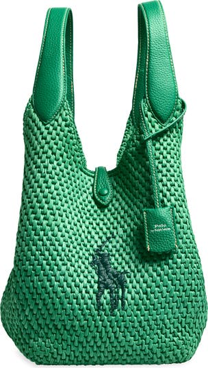 Crocheted raffia puts a breezy resort spin on this bucket-style tote detailed with an embroidered polo rider and a pebbled-leather logo tag.