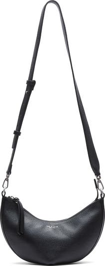 Clean lines and a crescent-shaped profile define a spacious shoulder bag suspended from a wide strap that adjusts for comfortable carry.