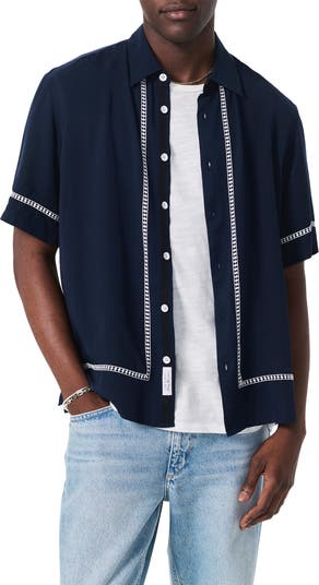 A little drama, a lot of style—this short-sleeve button-up blends a fluid, drapey fabric with eye-catching embroidered borders that command a second glance.