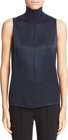 A stretchy rib-knit turtleneck plays textural foil to the slinky feel of a sleeveless top fashioned from lustrous silk. Exposed Merrow seaming down the front streamlines the look.