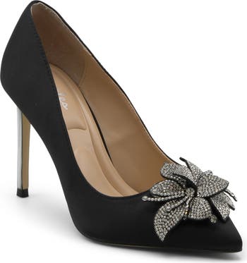 Embellished floral appliqués add whimsical charm to an event-ready pump balanced by a pointy toe and translucent stiletto heel.