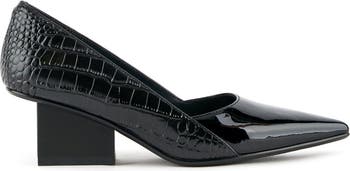 The Raila Pump offers a sophisticated and modern take on a classic silhouette. Featuring a sleek, pointed toe and a refined leather upper crafted in polished leathers and metallics, the Raila maintains an elegant profile. The defining feature is the geometric block heel, which provides stability and adds contemporary edge.