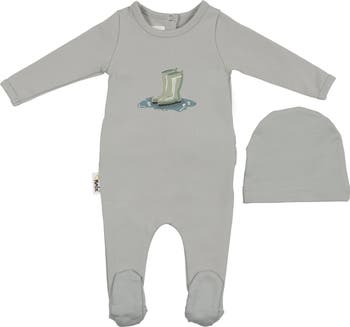 Whimsical graphics charm a cotton-rich footie framed with long sleeves and paired with a coordinating hat to give baby extra coverage.