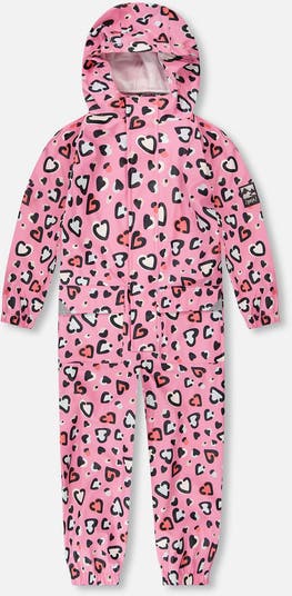 Our rain polyurethane one-piece in pink with heart print turns rainy days into joyful playtime. The color magically changes when it gets wet, while the 3,000 mm waterproof coating and welded seams ensure complete dryness. Featuring a hood, reflective bands, elastic cuffs, and a full-length zipper for easy dressing, this allover printed suit keeps little girls cozy and cheerful under any drizzle.