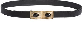 Two large stones sit at the center of the goldtone buckles of this slim, sophisticated belt cut from supple calfskin leather.