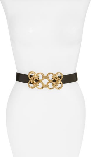Interlocking goldtone hardware furthers the contemporary edge of a form-fitting stretch belt fashioned with smooth leather.