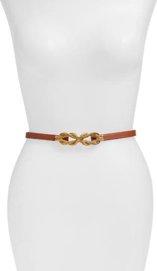 A pair of gilded eternity knots centers a slim, sophisticated belt cut from supple calfskin leather.