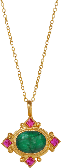 Dare to stand out with this handmade Pendant Necklace. Featuring vivid emerald gemstone and fuchsia pink crystals, this unique necklace will sparkle and shine around your neck.