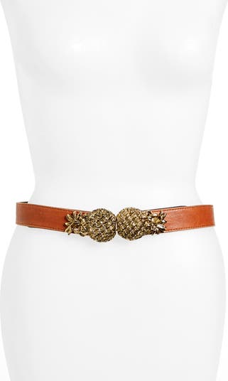 A pair of gilded pineapples add whimsical appeal to a slim, sophisticated belt crafted in the USA from supple leather.