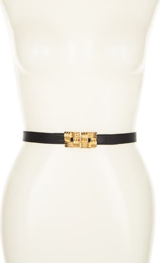 A pair of textured, goldtone squares centers a slim, sophisticated belt cut from supple calfskin leather.