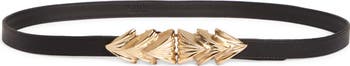 An ornate buckle gleams gorgeously on a calfskin-leather belt saturated in a soft shade of pink.