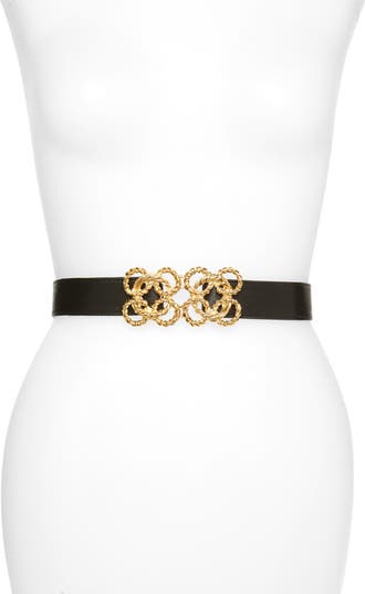 A rich leather belt is given an elegant twist with dual golden clasps in the shape of interlocking torchon loops.