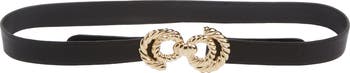 A pair of gilded, twisted circles centers a slim, sophisticated belt cut from supple calfskin leather.