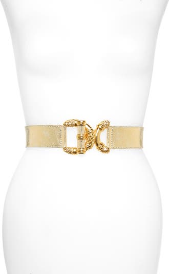 A fierce finish that instantly elevates any look, this leather belt features a golden D-ring buckle with snakeskin-patterned detailing.
