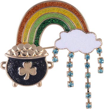 Catch the Luck of the Irish! Add a touch of whimsy to your St. Patrick’s Day look with this pot of gold and rainbow pin. Featuring a colorful glitter enamel rainbow coming out of a pot of gold and into a white glitter enamel cloud. Blue glass stone stones dangle from the cloud to create a rain look. This enamel pin is the perfect way to show off your festive spirit. Lightweight, durable, and full of charm, it’s ideal for jackets, bags, hats, or anywhere you want to spread a little luck!