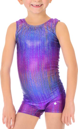 Shine as you leap across the floor, run down the runway, and stick your landing in Rainbow Blaze, a shiny yet soft unitard for athletes. This biketard is a rainbow of shades of pinks, purples, yellows, and blues. This super soft foil fabric features squares of colors that will shine on every athlete.