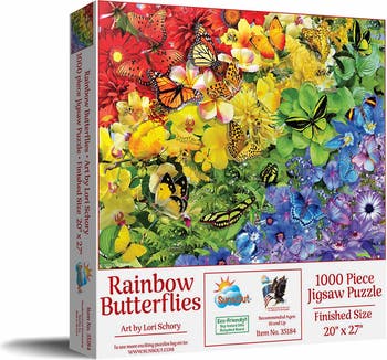 Indulge in the vibrant and mesmerizing colors of nature with the Rainbow Butterflies 1000 Piece Jigsaw Puzzle. Ideal for adults seeking relaxation, this awe-inspiring puzzle features vibrant artwork by Lori Schory, ushering you into a magical world of brilliantly colored butterflies amid thriving flora. A product of SunsOut Puzzles, this 20" x 27" masterpiece is crafted with precision and quality from durable, interlocking pieces that make assembly enjoyable and fuss-free. Made in the USA from high-quality recycled cardboard, the eco-friendly jigsaw puzzle is printed with soy-based inks, allowing you to contribute to the sustainability of the planet while engaging your mind. SunsOut, dedicated to delivering impeccable quality and customer service, also extends a worry-free guarantee, promising prompt resolution of any issues related to missing or damaged pieces. As you piece together this visually captivating puzzle, relish in the delicate intricacies of nature reflected in the striking patterns and vivid colors, and allow your senses to be captivated by this gateway to serene beauty. Celebrate creativity and art with the unique artistic vision of Lori Schory embodied in each butterfly, and let your creativity unfurl with every piece in this world where art and leisure beautifully intertwine.