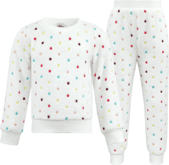 Covered in multicolor confetti dots for a fun and cheerful look kids will love Ultra-plush and fuzzy texture offers warmth and softness, perfect for cooler days Features ribbed cuffs and waistband for a secure fit that moves with them