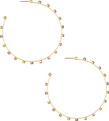 Multicolor crystals sparkle from these slender hoop earrings plated in 18-karat gold.