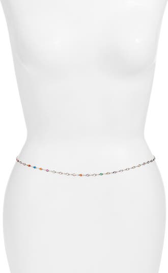 Make your ensembles shine from the center out with this crystal-stationed belly chain plated in 18-karat gold.