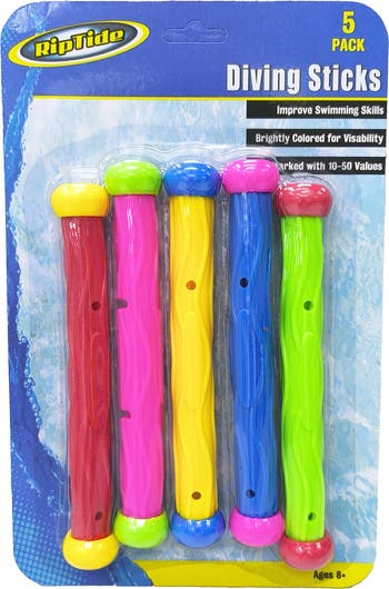 RIPPLE: RAINBOW DIVE STICKS - 5-Pack. Make a splash and boost swimming confidence with Rainbow Diving Sticks! Perfect for kids ages 8 and up, these brightly colored dive sticks glide smoothly underwater, making them easy to spot and grab. Great for fun pool games and skill-building exercises, they help improve underwater swimming skills while keeping kids engaged and active. Add color, challenge, and confidence to pool time with the RIPPLE Rainbow Dive Sticks 5-Pack—a vibrant and engaging way to boost underwater skills through play. These sleek, brightly colored sticks are designed to glide smoothly and sink upright, making them easy to spot and grab during swim sessions. Each stick is labeled with a point value from 10 to 50, turning every dive into a fun scoring game that keeps kids active, motivated, and entertained. Add excitement to parties, practices, or casual pool days. Built from durable, water-safe materials, they're made to last through splash after splash. Whether you're hosting a backyard bash or just encouraging everyday swim skill building, RIPPLE’s Rainbow Dive Sticks turn every dip in the pool into a colorful adventure. OVERVIEW: Set of 5 colorful dive sticks. marked with 10-50 values. Bright, colorful designs for easy underwater tracking and visibility. Glides smoothly underwater. Enhances swimming skills through play. Perfect for pool parties, swim training, or everyday fun!