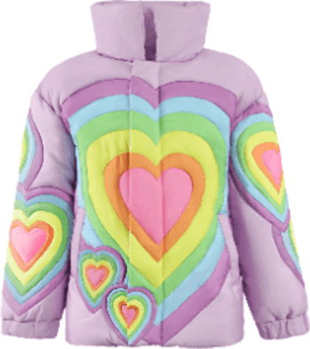 Stay warm and stylish with the Rainbow Heart Puffer, a vibrant jacket designed to keep you cozy while adding a pop of color to your winter wardrobe. Features bold, rainbow-colored heart designs that stand out against the soft lavender background, making it a fun and eye-catching choice for chilly days.