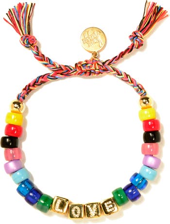 The Rainbow Love Bracelet sparkles with vibrant rainbow glass beads and pave letter charms. Playful rainbow threadwork add a cheerful twist, making it the perfect accessory to brighten your look with fun and color.