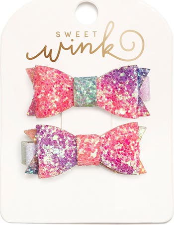 - This clip set includes: 2 multicolor glitter bow hair clips.