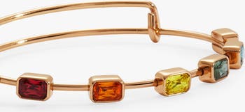 Color your stack with joy. This gold-tone bangle features a bold row of emerald-cut crystals in a rainbow ombré pattern—pink, red, orange, yellow, green, blue, and purple. Bright, vibrant, and unapologetically fun—this bracelet brings feel-good energy to any look.
