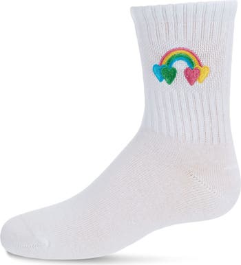 Every outfit needs a magical touch - that's where our Rainbow Patch Crew Sock comes in. A comfy crew length sock is adorned with an adorable rainbow on the side of each ankle for a colorful addition to your kid's ensemble. A cotton blend makes these comfortable and easy to wear all day long. Somewhere over the rainbow is one fashionable, happy kid!
