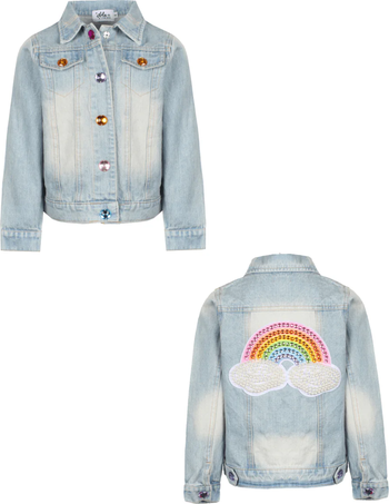 Light-wash denim jacket featuring a dazzling rainbow sequin and pearl design on the back. Front closure adorned with multi-colored gem buttons for a pop of color and sparkle. Designed with two front chest pockets for added style and functionality. Perfect for layering over casual outfits, adding a fun and vibrant touch.