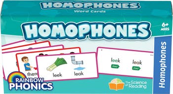 RAINBOW PHONICS: HOMOPHONES - Explore different spelling patterns with words that make the same sound but have different letters patterns. Homophones by Rainbow Phonics is a set of 65 cards covering the most common homophone patterns. Each card is double-sided, with homophone words and images on one-side, and an analysis of homophone spellings and sounds on the reverse. Children can see how different grapheme can make the same sound, but change the meaning of the word. The outside borders are color-coded in accordance with Phase 5.5 of Rainbow Phonics. Cards also integrate with the lessons in the Teacher Planners taught specifically across First and Second grades.