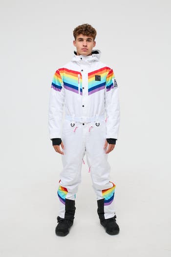 Model information - Height 5'11" | 38" Chest, 32" Waist | Wearing size Medium At a Glance Features: Are you bored of plain black, navy and grey ski suits? US TOO.... You need fun and colour on the mountains! We are empowering you to rip up the slopes with panache & style, whilst dropping jaws & turning heads as you strut into Après like a boss as the beat drops. On top of this all of our outerwear is made from recycled polyester meaning you can look amazing and do your bit for the planet at the same time! The OOSC Men's ski suit is the only piece of ski clothing you'll ever need, from dropping cliffs to dropping jagerbombs at Après, this one piece will keep you warm and dry all season long! The OOSC mens / unisex suit is a relaxed Freeride fit. Other Features: Water Proof Exposed Zippers Lift Pass Pocket Fleece Chin Guard Goggle Pocket Cuff Gaiters With Thumbholes Reinforced Durable Ankle Patches Helmet Adaptable Hood Elasticated Ankle Gaitors Velcro Adjustable Wrist Straps Elasticated Waist & Adjustable Belt Mesh Lined Vents Shaped Elbows & Knees Full list of our technical features. OOSC are extremely proud to have be able to say that ALL of our outerwear is made from Recycled Polyester and each suit is made from at least 100 plastic bottles!! (Read about how our suits are made from plastic bottles)