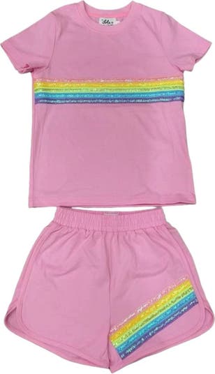 Playful two-piece set featuring a vibrant rainbow sequin design for a fun and colorful look. Soft pink fabric crafted for breathable comfort, perfect for active days and summer adventures
