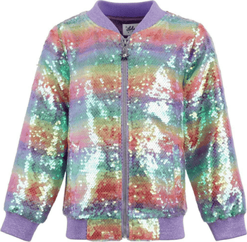 Vibrant bomber jacket covered in dazzling rainbow-striped sequins for a bold, sparkling look. Features a zip-front closure, ribbed cuffs, and hem for a comfortable and secure fit. Perfect for parties, events, or adding a statement piece to any outfit.