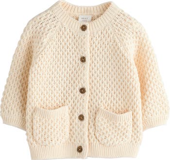 The brand's cheerful slogan and a charming rainbow are stitched on the back of a cuddly cardigan knit from pure cotton yarn.