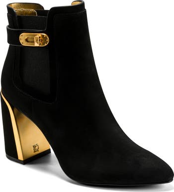 Brushed hardware and metallic accents create an elevated aesthetic on an almond-toe Chelsea boot lofted by a sculptural block heel.