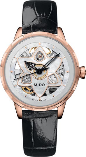 A mother-of-pearl skeleton dial is cut out to reveal a lotus flower window onto the intricate inner workings of this elegant automatic watch encased in highly polished rose gold stainless steel and framed by an alligator-embossed patent leather strap.