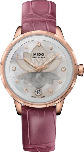 A lovely lotus flower and its serene reflection center the diamond-dotted mother-of-pearl dial on this Swiss-made watch featuring an automatic movement that provides up to 80 hours of power reserve, so you can heed the call to stillness for as long as you like. Engage the night-mode feature to illuminate the dial design and hands with a soft, calming glow.