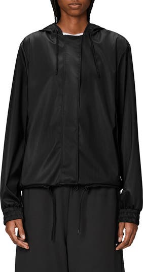 A slick finish adds swagger to a cropped rain jacket outfitted with the brand's signature details like underarm eyelets for ventilation and a cap-brim hood.