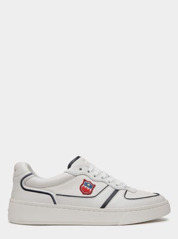 Contrast contours define this Raise sneaker in white and navy blue leather with a soft nappa-like finish. An embroidered Bally Crest patch embellishes the quarter.