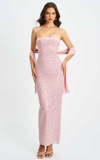 The Raizel Gown is an exquisite choice for prom, spring weddings, and formal celebrations, radiating elegance and charm. Crafted in shimmering pink beaded sequin lace with delicate satin trim, this gown offers a luxurious and ethereal appeal. The lace-up back and adjustable straps provide a customizable fit, while the fully lined interior ensures comfort. Finished with an invisible zipper for a seamless look, this gown comes with a matching scarf, adding a graceful touch to its timeless silhouette. And it is also available in Gold.