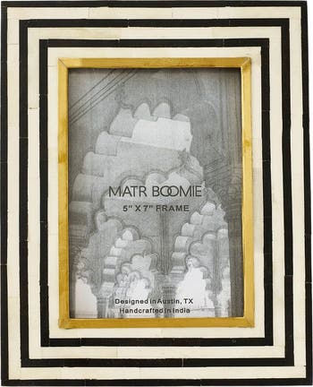 The Rajiva Black & Cream Picture Frame is handcrafted from ethically sourced bone in north central India and features a clean line, striped mosaic design. Master artisans in Old Delhi skillfully hand carve bone elements to create refined, modern mosaic designs. This handcrafted picture frame is thoughtfully designed for stylish display. Iron latches for frame closure. Sizes include: 4x6, 5x7