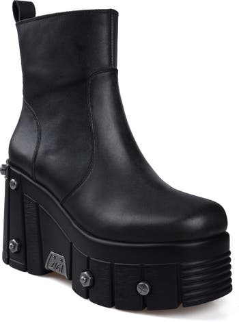 Brushed hardware adds a utilitarian aesthetic to the chunky platform and heel that elevate a sleek leather bootie fashioned with a side zipper for easy entry.