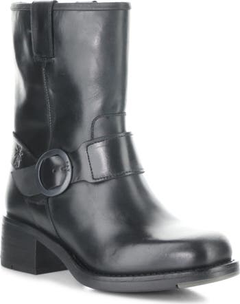 A decorative buckle enhances the equestrian vibe of this soft leather pull-on boot boasting comfortable cushioning and a low stacked heel.