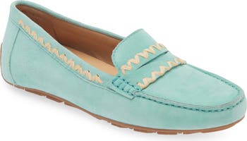 Jagged raffia topstitching lends artisanal charm to a polished penny loafer crafted from smooth leather and fitted with a removable padded insole.