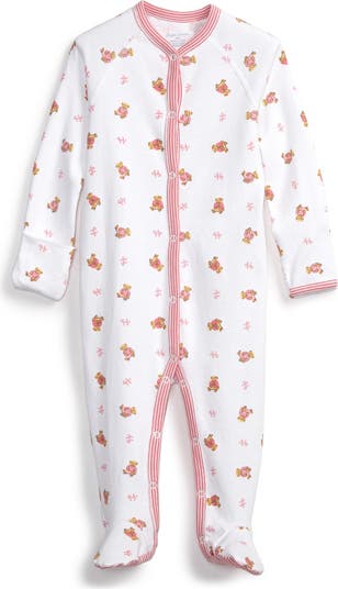 An allover teddy bear print furthers the cuddly appeal of a coo-inducing one-piece with fold-over cuffs to protect against accidental scratches.