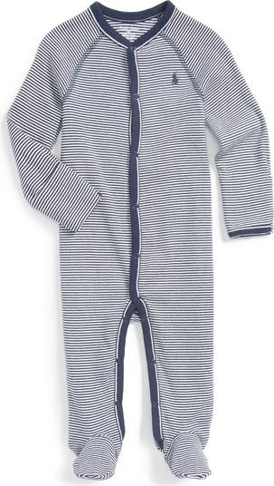 Slim stripes and a tonal Ralph Lauren logo provide dashing finishing touches for a comfy cotton-spun one-piece.